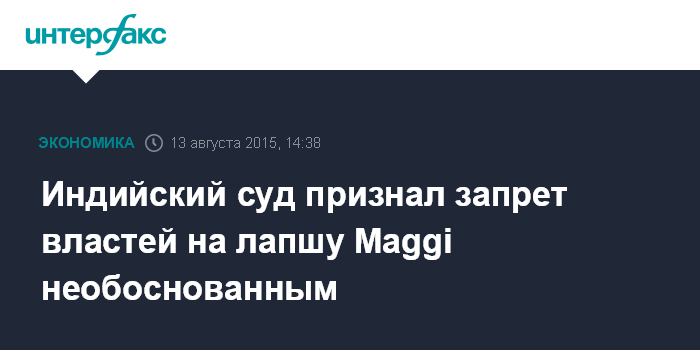 Москва. 13 августа. INTERFAX.RU - Высокий суд Бомбея в четверг признал необоснованным запрет индийских властей на лапшу быстрого приготовления под брендом Maggi, принадлежащим швейцарскому производителю продуктов питания Nestle, пишет Financial Times.