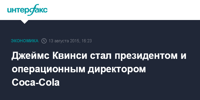 Москва. 13 августа. INTERFAX.RU – Coca-Coca Company, мировой лидер в производстве безалкогольных напитков, объявила о назначении Джеймса Квинси, с 2013 года возглавлявшего европейское подразделение компании, новым президентом и главным операционным директором.