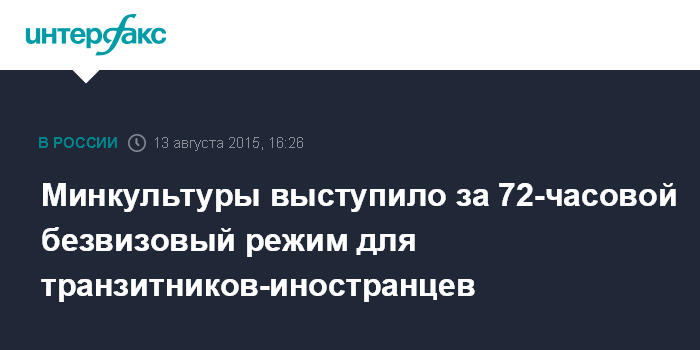 Москва. 13 августа. INTERFAX.RU - Минкультуры является сторонником идеи о введении 72-часового безвизового режима для транзитных туристов из ряда иностранных государств, заявил глава ведомства Владимир Мединский.