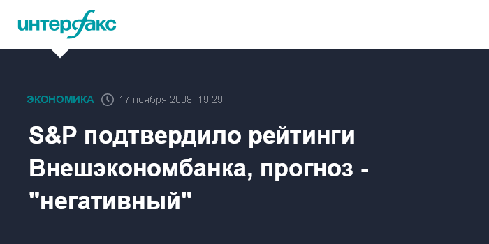 S&P подтвердило рейтинги Внешэкономбанка, прогноз - "негативный"