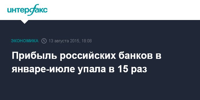 Москва. 13 августа. INTERFAX.RU – Прибыль российских банков за 7 месяцев сократилась до 34 млрд рублей с 513 млрд рублей за аналогичный период 2014 года, говорится в материалах ЦБ РФ.
