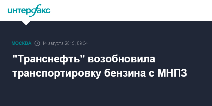 Москва. 14 августа. INTERFAX.RU - АК "Транснефть" возобновила прокачку бензина по нефтепродуктопроводу от "Московского НПЗ", сообщил "Интерфаксу" советник президента компании, пресс-секретарь Игорь Демин.