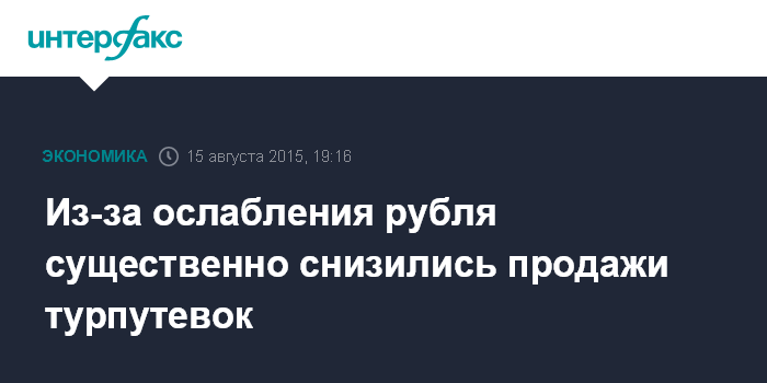 Москва. 15 августа. INTERFAX.RU - Турагентства отметили значительное снижение продаж на фоне падения рубля, сообщила "Интерфаксу" пресс-секретарь Российского союза туриндустрии (РСТ) Ирина Тюрина со ссылкой на информацию от агентов.