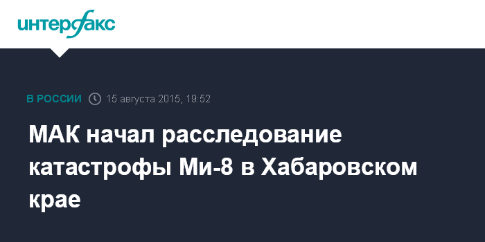 Москва. 15 августа. INTERFAX.RU - Межгосударственный авиационный комитет (МАК) приступил к техническому расследованию катастрофы вертолета Ми-8 в Хабаровском крае.