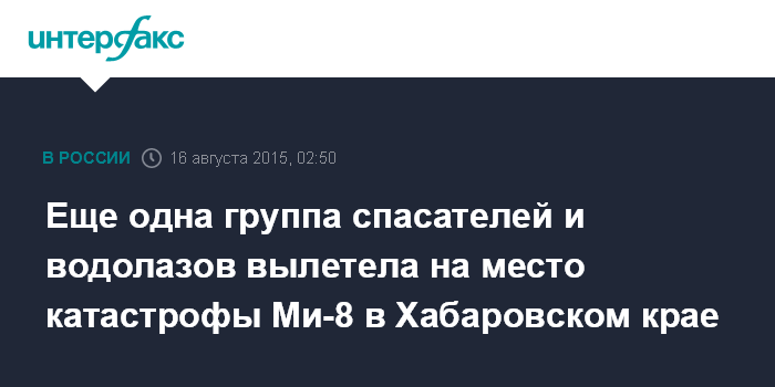 Москва. 16 августа. INTERFAX.RU - В поисковой операции на месте крушения вертолета Ми-8 в районе Шантарских островов участвуют 129 человек и 24 единицы техники, на помощь вылетел вертолет с группой водолазов и спасателей, сообщает в воскресенье ГУ МЧС России по Хабаровскому краю.