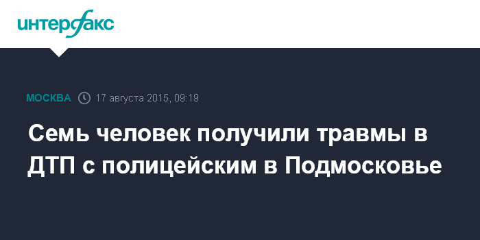 Москва. 17 августа. INTERFAX.RU - Сотрудник подмосковной полиции выехал на встречную полосу в Чехове и столкнулся с другой машиной, пострадали семь человек, сообщили "Интерфаксу" в пресс-центре МВД России.