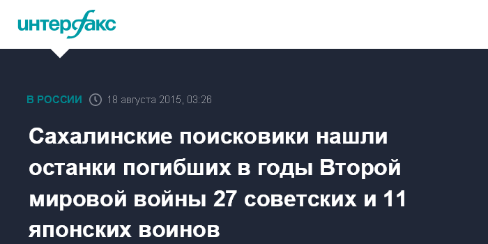 Москва. 18 августа. INTERFAX.RU - Поисковики нынешним летом нашли на северных Курилах и в центральной части Сахалина останки 38 солдат, в том числе 27 - советских воинов и 11 - японских, сообщает пресс-служба министерства культуры Сахалинской области.
