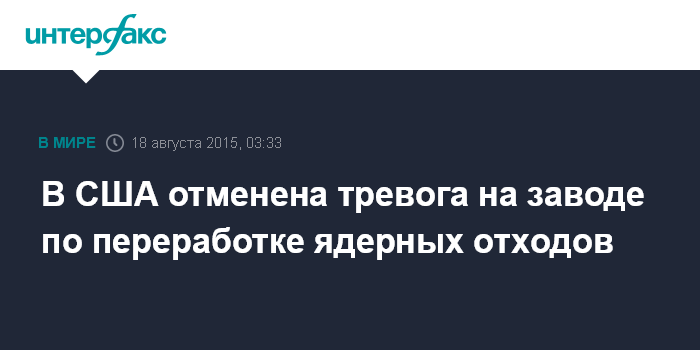 Москва. 18 августа. INTERFAX.RU - Тревога, объявленная ранее на комплексе переработки ядерных отходов "Саванна Ривер" в США, отменена.