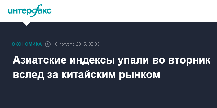 Москва. 18 августа. INTERFAX.RU - Азиатские фондовые индексы падают во вторник вслед за рынком КНР, опускающимся на опасениях, что недавние темпы роста акций компаний не оправданы перспективами их прибылей, сообщает агентство Bloomberg.