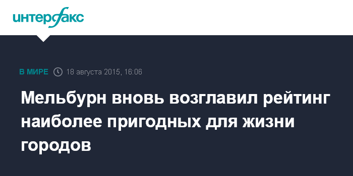 Москва. 18 августа. INTERFAX.RU - Мельбурн, Вена и Ванкувер признаны наиболее пригодными городами в мире для жилья в 2015 году, свидетельствуют данные, опубликованные исследовательской компанией Economist Intelligence Unit (EIU).