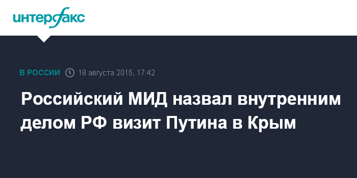Москва. 18 августа. INTERFAX.RU - Визит российских должностных лиц в Крым и Севастополь является внутренним делом РФ, реакция Киева на визит президента РФ Владимира Путина вызывает недоумение в Москве, заявили во вторник в МИД РФ.