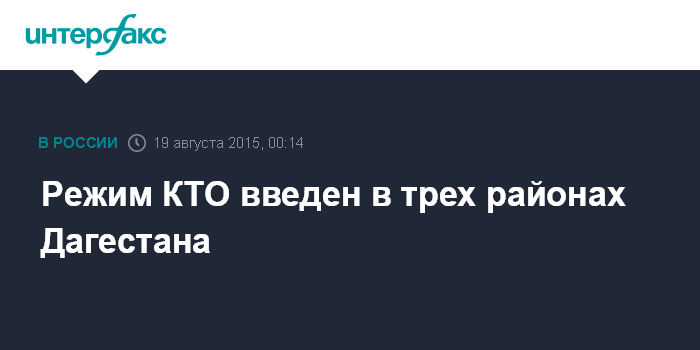 Москва. 19 августа. INTERFAX.RU - Правовой режим контртеррористической операции (КТО) введен во вторник в 20:00 в Табасаранском, Хивском и Сулейман-Стальском районах Дагестана, сообщил "Интерфаксу" представитель оперативного штаба в Дагестане.