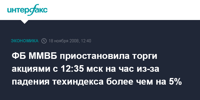 ФБ ММВБ приостановила торги акциями с 12:35 мск на час из-за падения техиндекса более чем на 5%