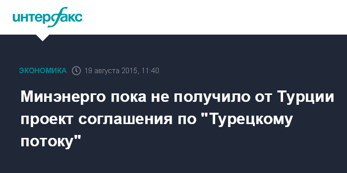 Москва. 19 августа. INTERFAX.RU – Минэнерго РФ пока не получило от турецкой стороны проект соглашения по газопроводу "Турецкий поток", рассказал "Интерфаксу" источник в российском ведомстве.
