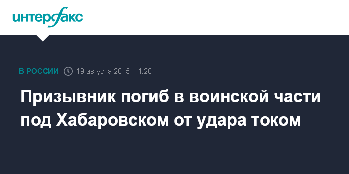 Москва. 19 августа. INTERFAX.RU - Военнослужащий-срочник из Челябинской области скончался в одной из больниц Хабаровского края, куда его привезли после удара током и падения с высоты, сообщил в среду агентству "Интерфакс" советник уполномоченного по правам человека в Челябинской области Алексей Ковалев в среду.