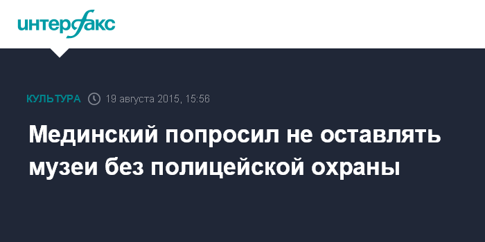 Москва. 19 августа. INTERFAX.RU - Министр культуры РФ Владимир Мединский направил письмо министру внутренних дел РФ Владимиру Колокольцеву и президенту РФ Владимиру Путину с просьбой сохранить в музеях посты полиции,