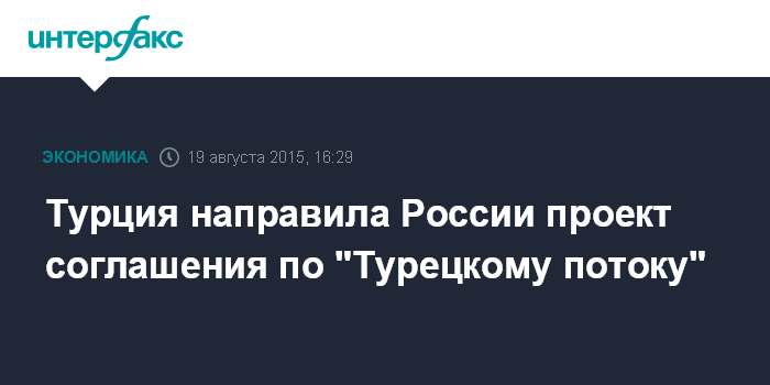 Москва. 19 августа. INTERFAX.RU – Турция направила в Россию проект документа по газопроводу "Турецкий поток", сообщил "Интерфаксу" источник в министерстве энергетики Турции. "Проект соглашения действительно передали российской стороне. Речь идет о строительстве одной нитки газопровода", - сказал собеседник агентства.