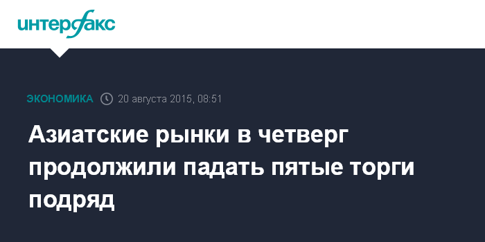 Москва. 20 августа. INTERFAX.RU – Азиатские фондовые индексы в четверг падают пятые торги подряд на новостях из США и Китая, сообщило агентство Bloomberg. Сводный индекс региона MSCI Asia Pacific опустился с открытия рынков на 0,1% - до 135,87 пункта.
