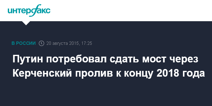 Москва. 20 августа. INTERFAX.RU - Президент России Владимир Путин потребовал жестко соблюдать сроки строительства моста через Керченский пролив, заявив, что объект должен быть сдан к концу 2018 года.