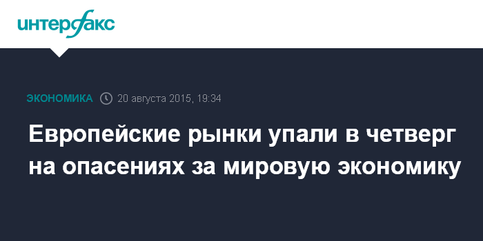 Москва. 20 августа. INTERFAX.RU - Европейские фондовые индексы завершили сессию в четверг падением на опасениях замедления темпов роста мировой экономики и неопределенности в отношении сроков повышения процентных ставок в США, сообщает агентство Bloomberg.