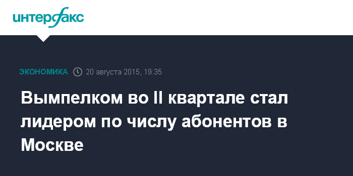 Москва. 20 августа. INTERFAX.RU - ПАО "Вымпелком" по итогам II квартала 2015 года стало лидером по количеству абонентов в Москве, заявила журналистам в четверг директор компании по маркетингу Московского региона Ирина Лебедева.