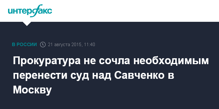 Москва. 21 августа. INTERFAX.RU - Прокурор назвал ходатайство о переносе процесса над украинской гражданкой Надеждой Савченко, обвиняемой в убийстве российских журналистов, из Донецка (Ростовская обл.) в Москву, не обоснованным.
