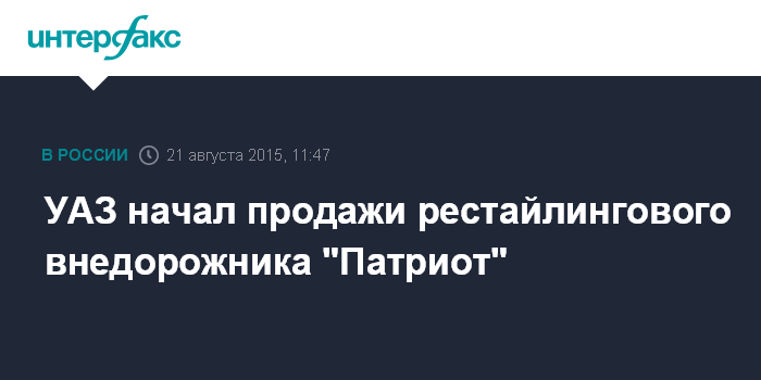 Москва. 21 августа. INTERFAX.RU - ПАО "Ульяновский автомобильный завод" (УАЗ, входит в группу Sollers) начало продажи обновленных внедорожников семейства "Патриот", сообщает пресс-служба УАЗа.
