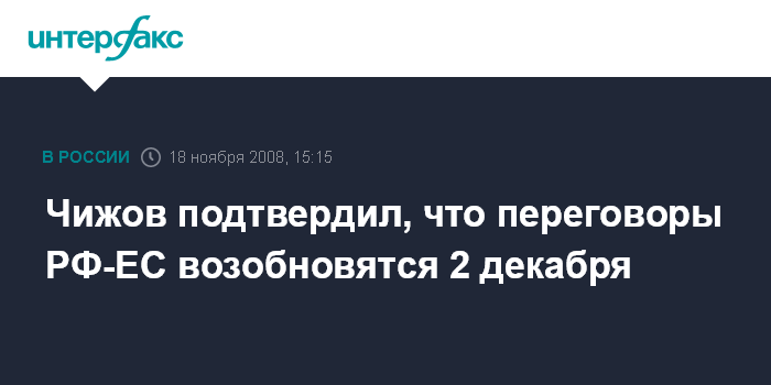 Москва. 18 ноября. INTERFAX.RU - Постоянный представитель России при европейских сообществах Владимир Чижов подтвердил, что новый раунд переговоров РФ-ЕС по новому договору о партнерстве и сотрудничестве состоится 2 декабря.
