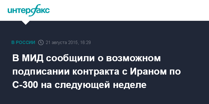 Москва. 21 августа. INTERFAX.RU - В Москве не исключают подписание нового контракта по поставке зенитных ракетных комплексов С-300 Тегерану на следующей неделе, когда в России будет находиться представительная иранская делегация во главе с вице-президентом страны Сурной Саттари.