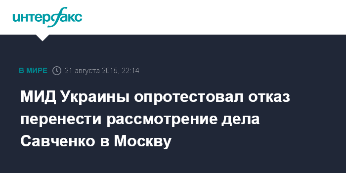 Москва. 21 августа. INTERFAX.RU - Министерство иностранных дел Украины выразило протест в связи с отказом Ростовского областного суда перенести рассмотрение дела Надежды Савченко в Москву.