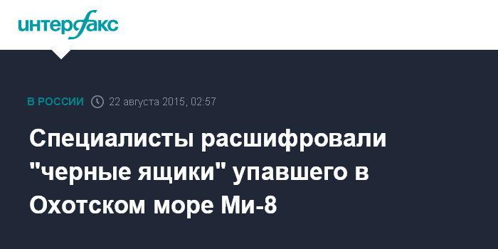 Москва. 22 августа. INTERFAX.RU - Расшифровать информацию с бортовых самописцев вертолета Ми-8, потерпевшего крушение 15 августа в районе бухты Онгачан в Охотском море, удалось специалистам, сообщается на сайте Межгосударственного авиационного комитета (МАК).