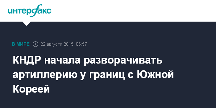 Москва. 22 августа. INTERFAX.RU - Северная Корея в субботу начала разворачивать артиллерийские орудия на границе Демилитаризованной зоны, передает телеканал НТВ со ссылкой на южнокорейское агентство "Ренхап".