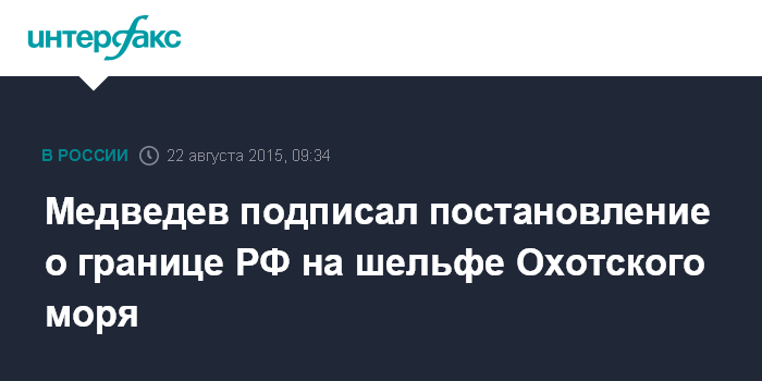 Москва. 22 августа. INTERFAX.RU - Премьер-министр РФ Дмитрий Медведев сообщил о подписании постановления правительства РФ, закрепляющего границу страны на континентальном шельфе Охотского моря. Об этом он заявил, отвечая на вопрос одного из участников Всероссийского молодежного образовательного форума "Итуруп".