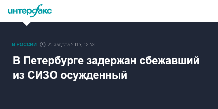 Москва. 22 августа. INTERFAX.RU - Сотрудники УМВД по Московскому району Петербурга в субботу задержали мужчину, совершившего 17 августа побег из следственного изолятора на улице Академика Лебедева. Задержанный был передан сотрудникам УФСИН и помещен в СИЗО.