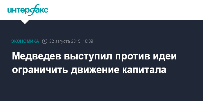 Москва. 22 августа. INTERFAX.RU - Премьер-министр Дмитрий Медведев выступает против введения ограничений на движение капитала.