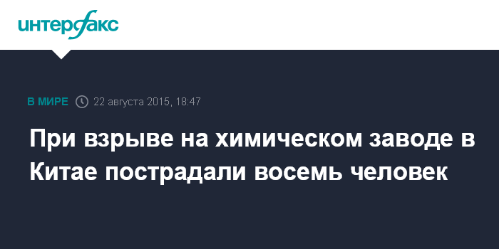 Москва. 22 августа. INTERFAX.RU - В результате взрыва на химическом заводе в Китае пострадали восемь человек. Об этом сообщается в твиттере издания The People's Daily. По предварительным данным, погибших нет.