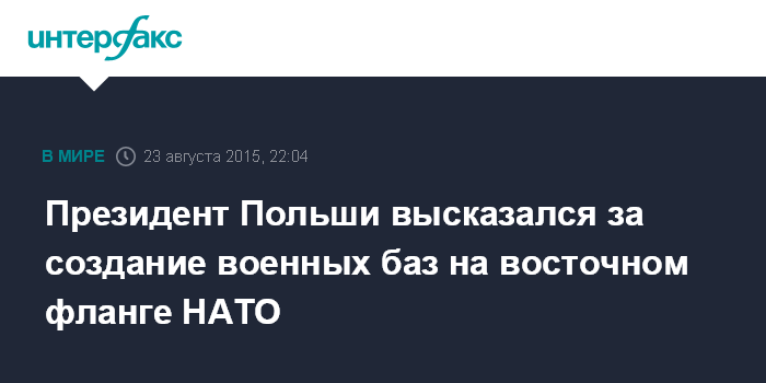 Москва. 23 августа. INTERFAX.RU - Президент Польши Анджей Дуда высказался за создание баз НАТО на восточном фланге альянса.