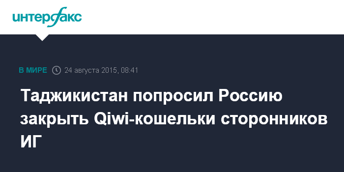 Москва. 24 августа. INTERFAX.RU - Правоохранительные органы Таджикистана обратились к российской группе Qiwi, владеющей международной платежной системой Qiwi Wallet, с просьбой заблокировать кошельки подозреваемых в причастности к террористической организации "Исламское государство" (ИГ, запрещена в РФ и ряде других стран)), сообщили "Интерфаксу" в понедельник источники в таджикских силовых ведомствах.