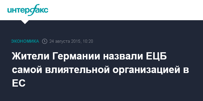 Москва. 24 августа. INTERFAX.RU – Жители Германии считают Европейский центральный банк (ЕЦБ) самой влиятельной организацией в Европейском союзе, свидетельствуют результаты опроса, проведенного по заказу Deutsche Welle.