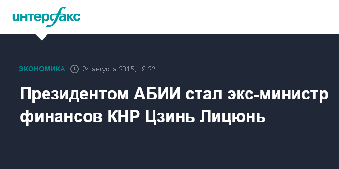 Москва. 24 августа. INTERFAX.RU - Президентом Азиатского банка инфраструктурных инвестиций (АБИИ) в понедельник был избран бывший министр финансов КНР Цзинь Лицюнь, сообщил "Интерфаксу" директор департамента международных отношений Минфина РФ Андрей Бокарев.