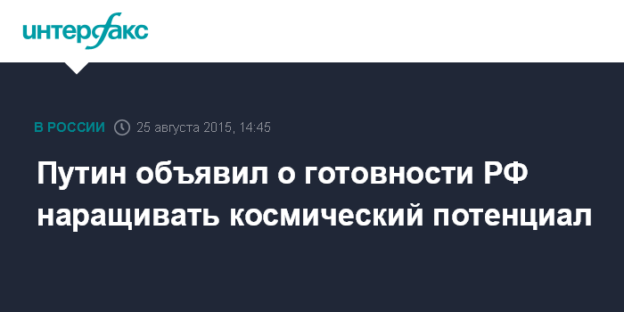 Москва. 25 августа. INTERFAX.RU - Россия намерена наращивать космический потенциал и производство военной авиатехники, заявил президент РФ Владимир Путин.