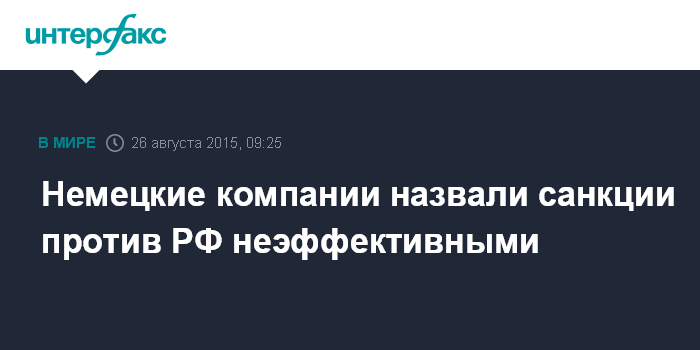 Москва. 26 августа. INTERFAX.RU - Западные санкции против РФ неэффективны, заявила Германо-российская внешнеторговая палата (AHK), сославшись на проведенный ею опрос компаний.