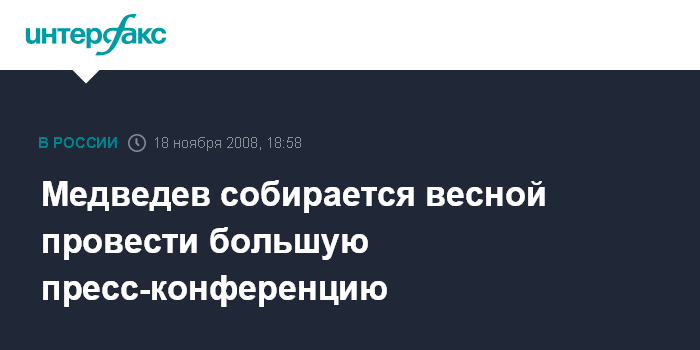 Москва. 18 ноября. INTERFAX.RU - Президент России Дмитрий Медведев собирается регулярно встречаться с региональными журналистами, а весной проведет большую пресс-конференцию, сообщила пресс-секретарь главы государства Наталья Тимакова.
