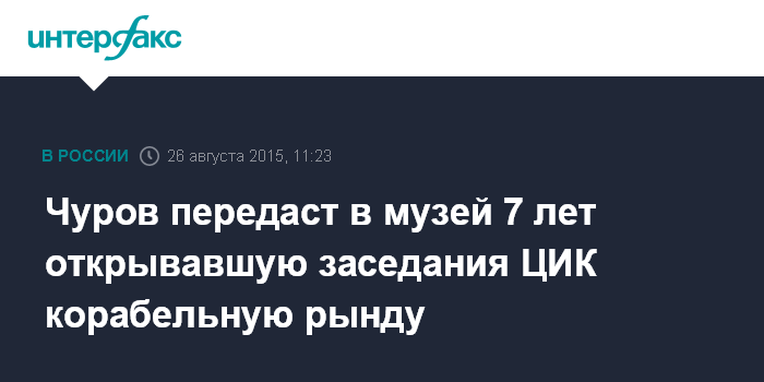 Москва. 26 августа. INTERFAX.RU - Глава ЦИК РФ Владимир Чуров заявил, что передает в музей малую корабельную рынду, ударами в которую начинались все заседания федерального Центризбиркома за последние 7,5 лет.