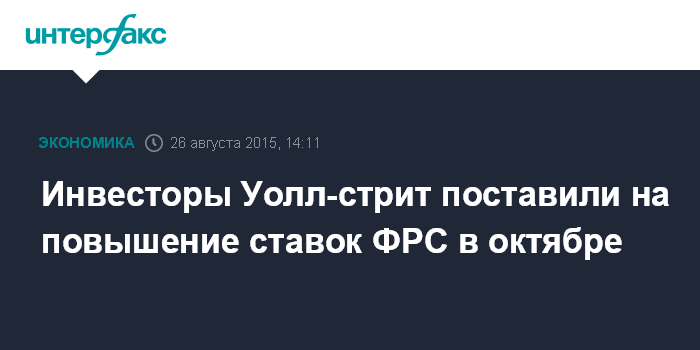 Москва. 26 августа. INTERFAX.RU – Уолл-стрит весь год сбрасывал со счетов возможность повышения процентной ставки Федеральной резервной системой (ФРС) в октябре, но теперь этот месяц все чаще появляется в расчетах трейдеров, сообщает агентство Bloomberg.
