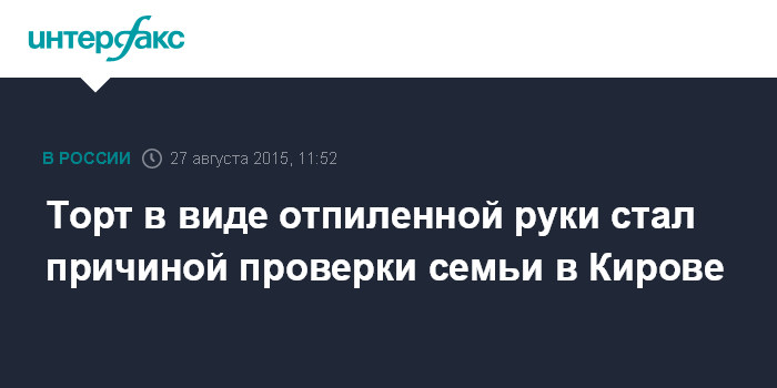 Москва. 27 августа. INTERFAX.RU - Торт, выполненный в форме "кровавой" отрезанной человеческой руки и подаренный родителями на 10-летие сына, привлек пристальное внимание управления опеки и попечительства Кирова, сообщили агентству "Интерфакс" в пресс-службе администрации города в четверг.