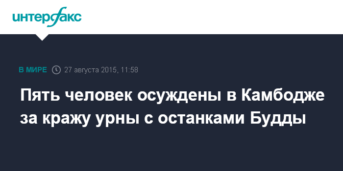 Москва. 27 августа. INTERFAX.RU - Суд Камбоджи приговорил пятерых мужчин к семи годам тюремного заключения за кражу в провинции Кандаль золотой урны, где хранились останки Будды - волосы, зубы и кости, сообщает в четверг таиландское издание "Бангкок пост".