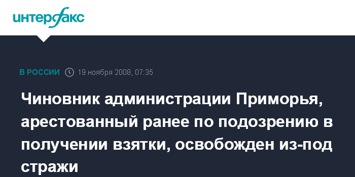 Владивосток. 19 ноября. ИНТЕРФАКС - ДАЛЬНИЙ ВОСТОК - Директор департамента лицензирования и регулирования отношений в сфере потребительского рынка администрации Приморья Леонид Бельтюков, который 3 апреля был задержан в рамках возбужденного против него уголовного дела по подозрению в получении взятки, вышел на свободу.