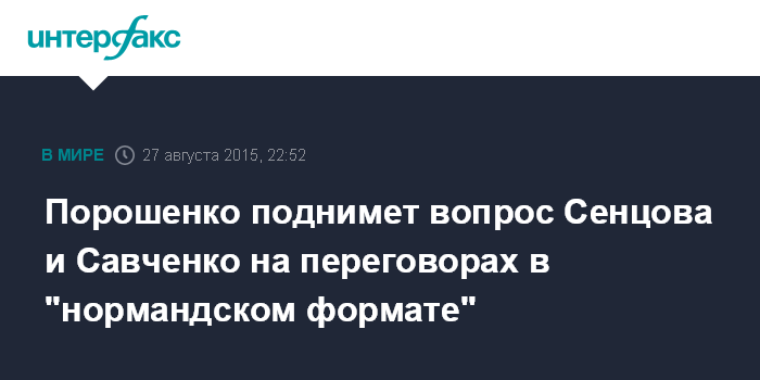 Москва. 27 августа. INTERFAX.RU - Президент Украины Петр Порошенко на переговорах в "нормандском формате" будет поднимать вопрос находящихся в России летчицы Надежды Савченко и недавно осужденного к заключению Олега Сенцова, сообщается в фейсбуке Порошенко в четверг ночью.