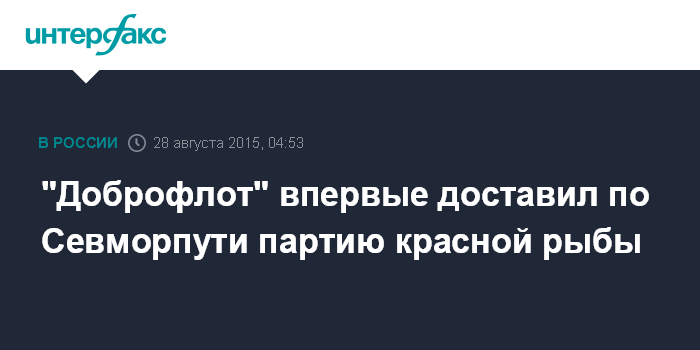 Москва. 28 августа. INTERFAX.RU - Группа компаний "Доброфлот" (Приморский край) впервые доставила рыбу с Дальнего Востока транспортным рефрижератором через Северный морской путь (СМП).